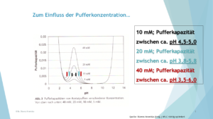1. Der verwendete Puffer ist zu schwach: Je geringer die Konzentration, desto kleiner der pH-Wert-Bereich, in dem der Puffer für einen konstanten pH-Wert sorgen kann, siehe dazu Abbildung 1.